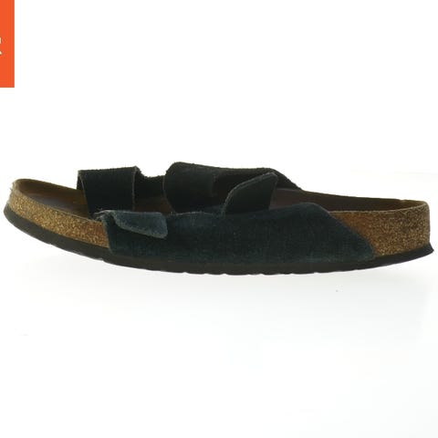 Et par Birkenstock sandaler i størrelse 42. Sandalerne har en sort læderrem og en korksål, der giver komfort og støtte til foden. De er designet med to justerbare spænder for en bedre pasform.