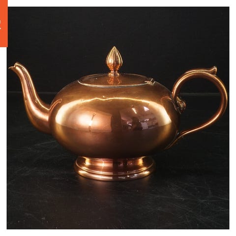 Kobbertekande med aftageligt låg og buet tud. Den har en rund form og en robust håndtag, der gør den nem at bære. Perfekt til at brygge te eller som et dekorativt stykke i køkkenet. Diameter på 15,5 cm.