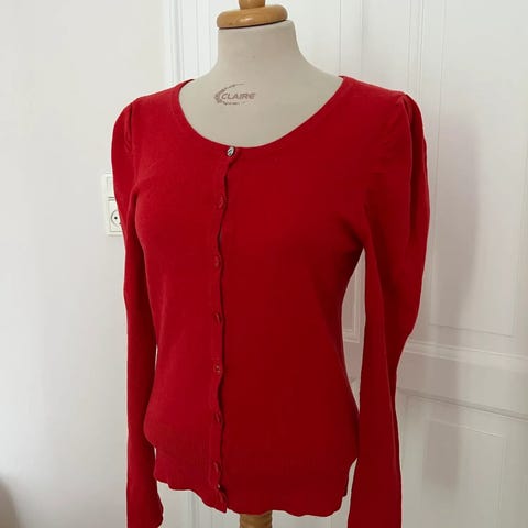 Fin beige angora-cardigan med rund hals og nitter på ærmerne. Enkelte af nitterne mangler.