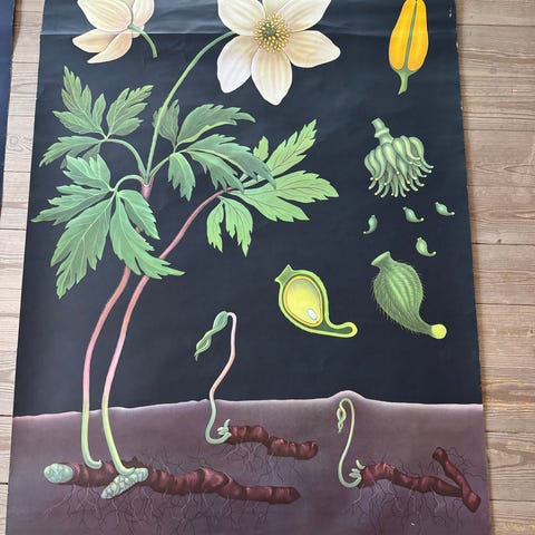 Botanisk skoleplakat med detaljerede planteillustrationer. Plakaten viser forskellige stadier af planternes udvikling, herunder rødder, blade, blomster og frø. Velegnet som undervisningsmateriale eller dekoration i rum, hvor botaniske motiver ønskes. Trykt på kraftigt papir/ lærredsagtigt materiale med ophæng i top og bund, så den kan hænges direkte på væggen.