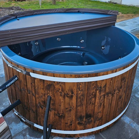 Har dette vildmarksbad som er fra august 25. Det har led lys i bunden og i siderne. 12 dyser i kanten. Den har et stort fyr på udvendigt side som varmer op i løbet af ugen tid. Det er sort og er med vedligeholdelse fri træ på siden ny pris er 36000