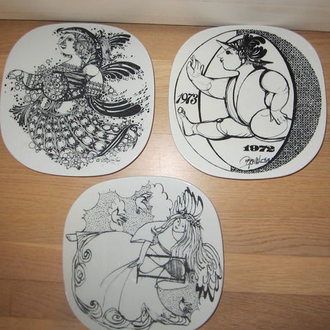Bjørn Wiinblad Nymølle vægplade i porcelæn med sort grafisk motiv på hvid bund. Pladen har kvadratisk, let afrundet form og er dekoreret med tegnet motiv med årstal og figurer. Bagsiden er mærket med Bjørn Wiinblads signatur og Nymølle Denmark. Velegnet som vægdekoration eller samlerobjekt i en serie af dekorative plader.