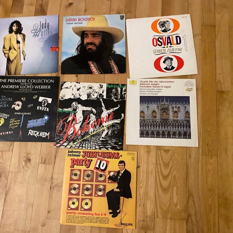 Vinylplader i forskellige farver monteret som vægdekoration i rammer. Sættet omfatterGasolin live i skandinavien ,gul,rød,mørkeblå,sort 1978,lyseblå fra senere,sælges samlet for 6000kr,cover er i rammerne,