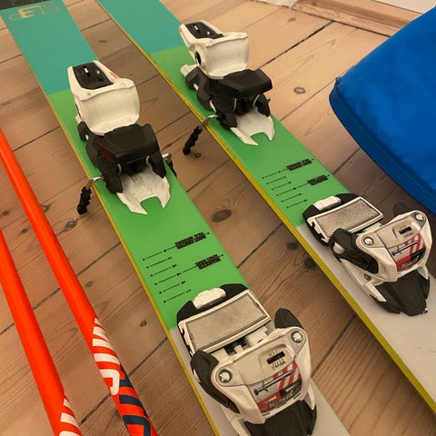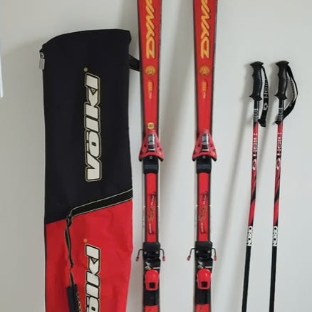 Völkl alpinski med bindinger i sort og rød grafik. Skiene har monterede Marker 10.0 bindingssystemer, som kan justeres efter støvlestørrelse. Egnede til alpint skiløb på pister. Undersiden er sort med røde Völkl-logoer. Velegnet til brugere, der søger et par klassiske alpinski med integrerede bindinger.
