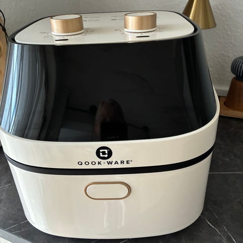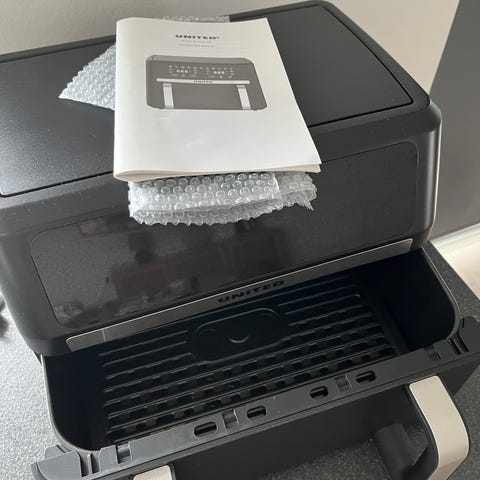 Brugt men fin. Det er to separate skuffer på hver 4,5 liter og en stor skuffe på 10 liter og en rumdeler til. Der følger to nye bunde med til de to små skuffer og en rumdeler til den store skuffe på 10 L. Det er med touch knapper og man kan i hver skuffe justere tider og grad, hvis man har to skuffer i med forskellige indhold i.