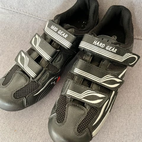 Cykelsko i størrelse 44. Skoene er sorte og udstyret med tre velcrostropper over foden for justerbar pasform. Undersiden har monterede klamper til klikpedaler. Overdelen er perforeret i fronten for ventilation. Velegnet som cykelsko til landevej eller spinning, afhængigt af pedelsystem og kompatibilitet.