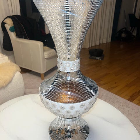 Spejlet måler 37 cm i diameter og lysestagen måler 27 cm i højde.