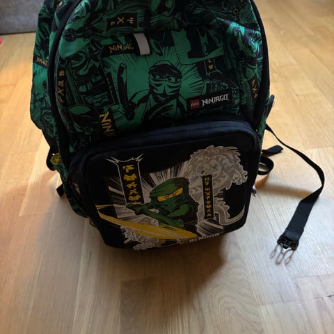 Ninjago skoletaske i god stand. Brugt i godt et år. Alt fungerer, minimal slid, men skal nok lige tørres af. Der er tegn på brug i bunden af det store rum (se billede) ellers intet. Alle lynlåse intakte, holder til cykelnøgle samt idrætstaske, der skal klikkes på.