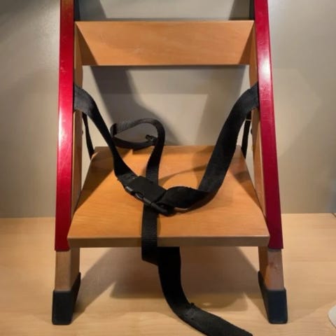 Højstolen har sort sæde med rem og træramme. Egner sig til montering på en almindelig spisebordsstol, så barnet kan sidde ved bordhøjde. Sædet har ryglæn og sikkerhedssele for at holde barnet på plads. Velegnet til brug i hjemmet eller som ekstra stol hos bedsteforældre eller på rejser.