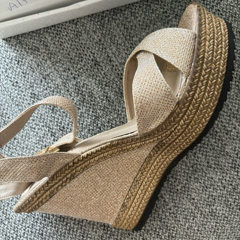 Vintage måske fra 1970erne? Guld sandaler. Læder. Super god stand, men jeg har problemer med min storetå, så nu må det videre pga jeg kun kan gå uden hæl desværre