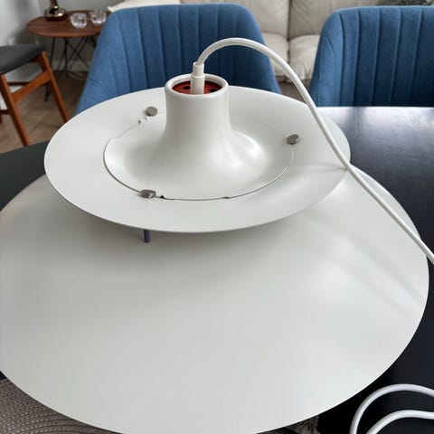 Louis Poulsen PH loftslampe PH5 designet af Poul Henningsen. Lampen er udført i metal med flere skærme, der giver et blændfrit og jævnt lys ned over bordet. Farven fremstår i en lys, neutral hvid nuance. Velegnet som belysning over spisebord eller i opholdsrum, hvor der ønskes et funktionelt og direkte nedadrettet lys kombineret med diffus rumbelysning.