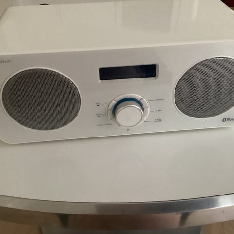 Lyst træ kabinet. Med ur og alarm. 230V. Kan også køre på batterier, så den kan bruges som nødradio. Virker perfekt. Standen er næsten som ny. Mål (selve kabinettet uden antenne, knapper og håndtag) 25cm bred, 9,5cm dyb, 16,5cm høj