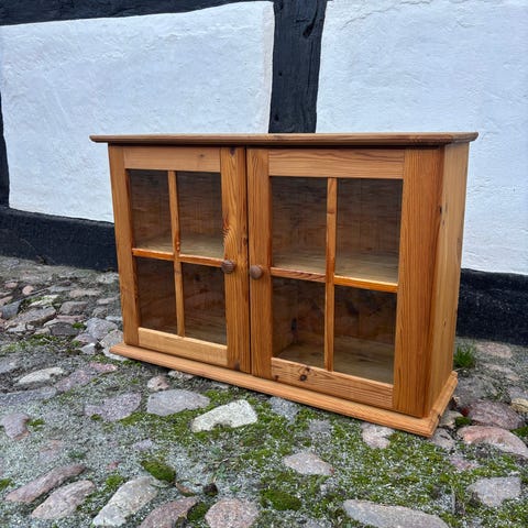Funktionelt og solidt vitrineskab fra Trævarefabrikkernes udsalg i massivt fyrretræ. Har fået en hvidpigmenteret maling og fremstår som lyst mål: B100 H70 D30 cm.