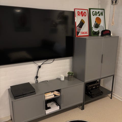 Spacious storage with sliding doors and interior shelves – perfect for TV equipment, consoles, or general storage.