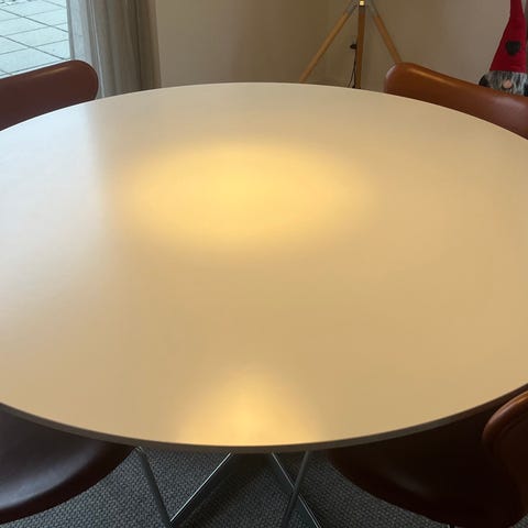 Et flot Fritz Hansen rundt bord med 4 stole, bordet hedder pelikan design, det står flot.Stolene er designet af Kasper Salto bordet er 106 Ø H 73 siddehøjde på stolen er 46 i sidde højde dette er et bord som skal ses Bud modtages gerne