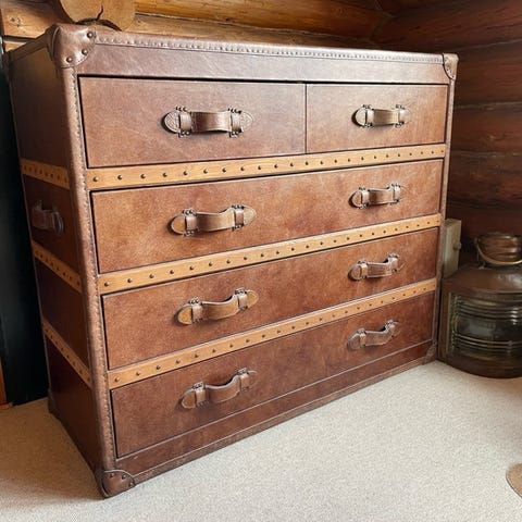 Jeg sælger denne store "rejsekuffert" kommode i læder og med træ-effekter – et statement piece til dig med smag for kvalitet og karakter. Udført i kraftigt nøddebrunt læder med massiv tilstedeværelse og klassisk britisk attitude. Indvendigt gemmer den på flere rummelige skuffer, foret med olivengrønt stof – en elegant kontrast til det rå ydre. (nypris 38.000 kr. købt i England)