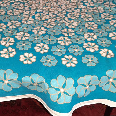 Skøn original 70' er dug. 150 i diameter. Matrriale kraftigt bomuld. Har nogle steder med brugsspor I stoffet. Ikke noget man umiddelbart lægger mærke til, men se foto med nærbilleder.