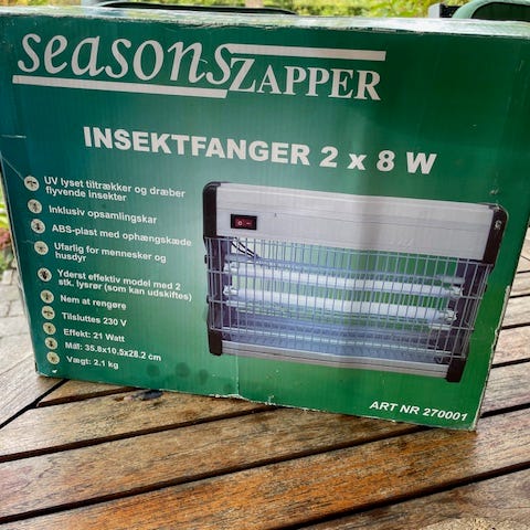 Seasons Zapper insektfanger med 2 x 8W lysrør. Enheden er beregnet til indendørs brug og tilsluttes 230V / 50Hz. Insektfængeren bruger 2 stk. T5 BL F8W lysrør til at tiltrække insekter, som derefter elimineres ved hjælp af høj spænding bag beskyttelsesgitteret. Velegnet til rum, hvor man ønsker at reducere flyvende insekter på en elektrisk måde. Brugermanual bør følges, og de elektriske rør må ikke berøres under brug. Vi næsten ikke bruger. Du Kommun 10 km at købe.