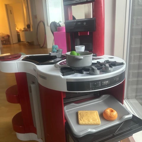 Miele børnekøkken i træ med ovn, vask og kogeplader. Kogeplader har lys og lyd. Køkkenet har hylder til opbevaring og en vandhane.