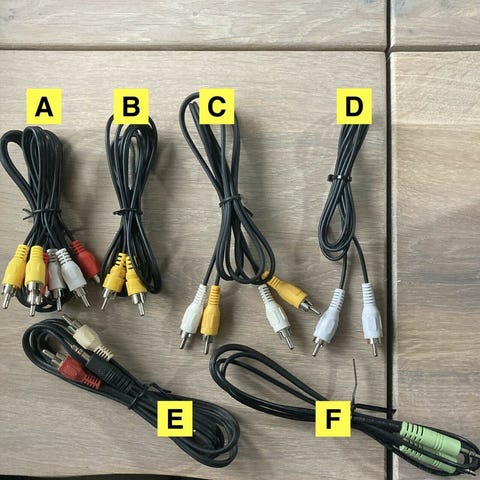 A - Længde 150 cm. I den ene ende: Video og audio phono/RCA-stik (han) (gul: video, hvid: audio) og i den anden ende: Mini-B plug.