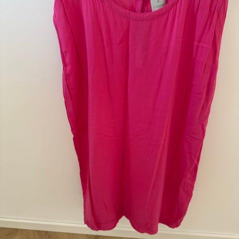 Culture hverdagskjole i viskose i str. S. Kjolen er multifarvet med mønstret print i gråtoner og en kontrastfarvet, rosa taljedetalje. Den har korte ærmer, v-udskæring foran og rund hals bagpå. Længden går cirka til over knæet afhængigt af højde. Velegnet som hverdagskjole til kvinder.
