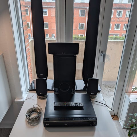 LG BH6420P 3D Blu-ray hjemmebiograf system i sort. Systemet består af 3D Blu-ray afspiller og flere højttalere, herunder centerhøjttaler, front- og baghøjttalere samt subwoofer. Afspilleren har tilslutninger på bagsiden til højttalere, HDMI, antenne, netværk og lydindgange. Systemet er egnet til hjemmebiografbrug med surroundlyd til film, tv og musik/radio via indbygget receiver. Brugervejledning medfølger.