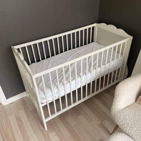 babyseng: 60x120cm. Kan indstilles i 3 højder inkl madras, lagner og sengerand