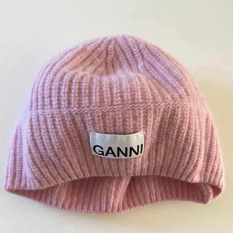 Ganni hue i grøn uld i one size. Modellen er ribstrikket med ombuk og har Ganni-logo foran. Materialet er uld, som giver en varm og blød kvalitet. Passer som hovedbeklædning til kvinder i én størrelse.