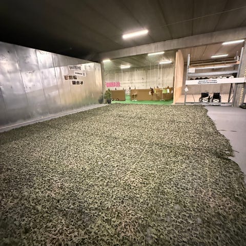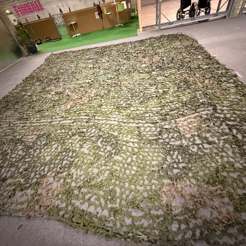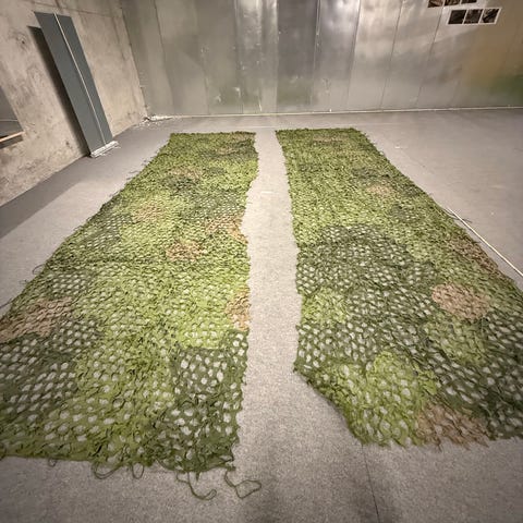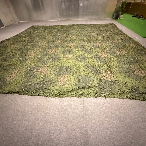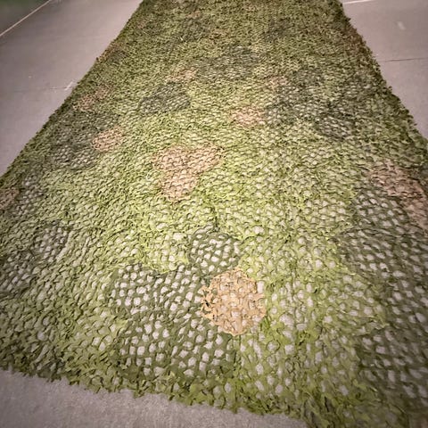 Camouflagenet i grønne nuancer. Nettet har udskårne, bladlignende stykker, som giver et brudt mønster egnet til afdækning og skjul. Kan anvendes til eksempelvis jagt, friluftsaktiviteter, dekoration eller som baggrund i rum og udstillinger. Materiale fremstår som syntetisk tekstil/plast.
