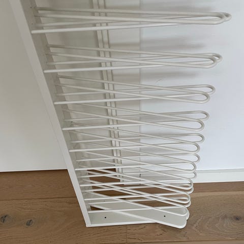 Sig farvel til bunker af jeans og bukser! Denne solide buksebøjle giver dig et godt overblik, så du kan indrette en løsning, der matcher og føles, som om den er indbygget. med skinner komplet til skruer i garderobeskabe model Pax fra IKEA modul komplement21877,metal bøjle i grå farve, kan hentes for 150 kr..