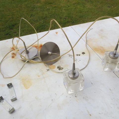 Retro loftslamper i orange aluminium med to lysstofrør. Har siddet på en skole.