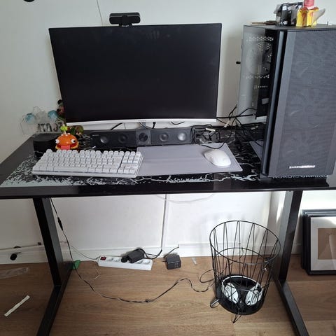 Der følger en musemåtte til hele bordpladen, kabelskjuler og skruer til det hele.