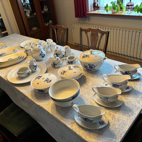 Stellet indeholder 10 små tallerkener, 10 store tallerkener og 2 skåle. Alle er i fin stand og brugt kun få gange. Det er i meget fin kvalitet, med klare smukke farver.