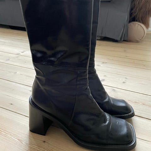 Langskaftet støvle med 5.5 cm blokhæl og spids tå. Denne støvle er fremstillet med en knæhøj silhuet og har en slank, spids tå og en robust blokhæl. Enkel syning tilføjer en raffineret detalje til dette håndlavede design.