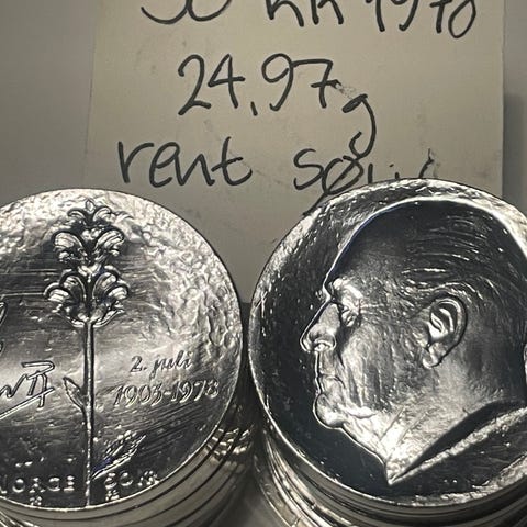 sølvmønt, norge rent sølvinholde 25,37 gram, spot + 5%