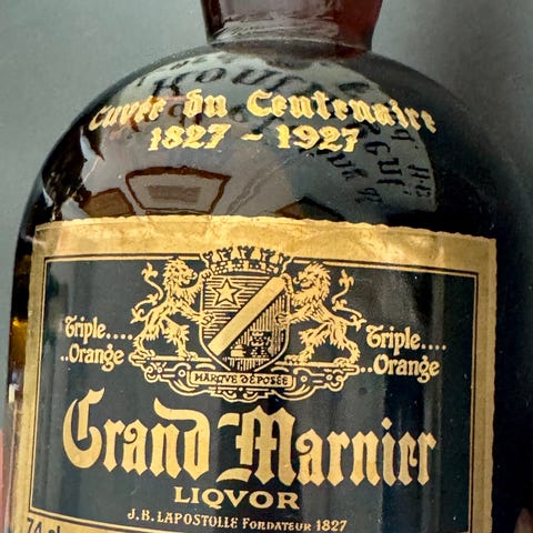 Original helt intakt glasflaske i original emballage med ubrugt tappeudstyr. Har været påfyldt og leveret til chokoladefabrikken Viking Chokolade omkring 1990. Indholdet har været brugt til marcipanbrød med Grand Marnier.
