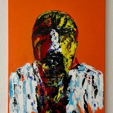 Abstrakt maleri med to menneskelignende figurer udført i akrylmaling på lærred. Motivet viser to frontvendte figurer på mørk baggrund, hvor den ene er domineret af blå nuancer og den anden af orange og pink. Ansigterne er malet med kraftige, tykke lag maling i stærke kontrastfarver som gul, rød, blå, hvid og sort, hvilket giver en tydelig, struktureret overflade. Billedet er kendetegnet ved ekspressive penselstrøg og kraftige farvefelter. Velegnet som vægudsmykning i stue, kontor eller andre opholdsrum, hvor man ønsker et farverigt, abstrakt udtryk.