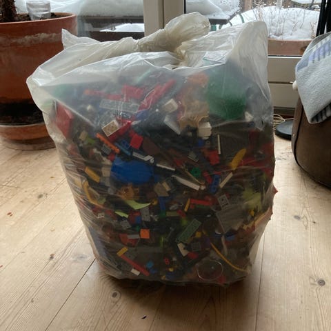LEGO klodser i blandede farver og størrelser. Klodserne ligger i en kubeformet opbevaringskasse, som kan åbnes, så klodserne kan hældes ud. Egnet til fri leg og byggeri med forskellige typer LEGO-elementer. Antal klodser og specifikke sæt er ikke angivet.