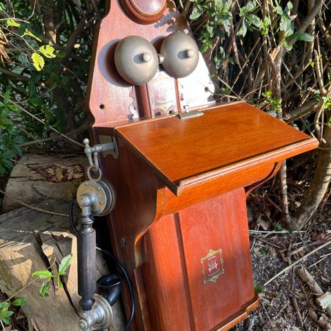 Vægtelefon i antik stil udført i mørkt træ med metaldetaljer. Telefonen har to klokker øverst, håndsæt i siden samt drejehåndtag. Egnet som dekorativ genstand eller samlerobjekt. Brand og model er ikke angivet.