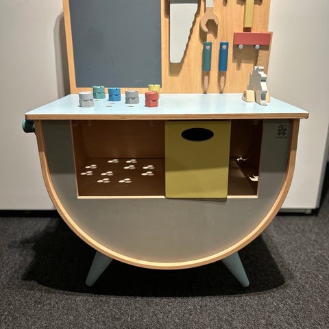 Sebra Værkstedsbord inkl. forskelligt værktøj samt skruer og brædder. Der er synlige brugsspor men der er stadig masser af leg tilbage i bordet.