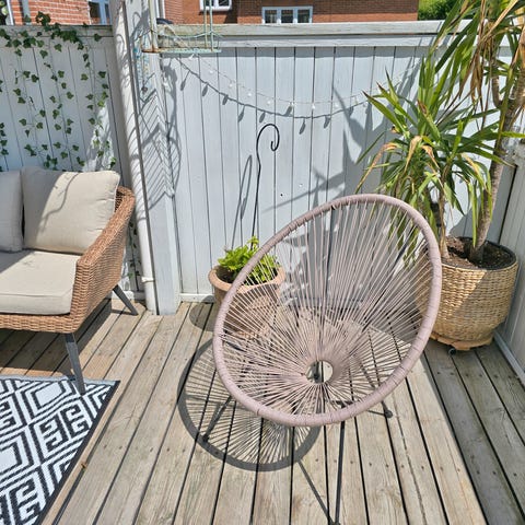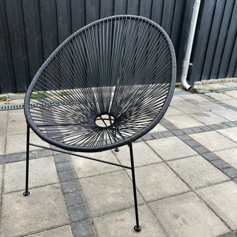 Stol loungestol i moderne design med sæde i gule plast- eller PVC-snore og sort metalstel. Stolen har en skålformet, dråbeformet siddeflade med åbent flettet look. Egnet som afslapningsstol i stue, værelse eller udestue.