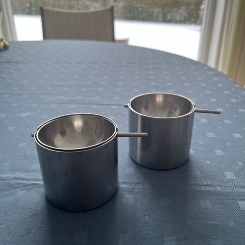 Stelton askebæger i rustfrit stål. Består af cylindrisk beholder og tilhørende låg med integreret skeåbning i kanten.