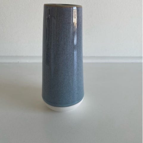 Morsø vase i keramik. Vasen har en cylindrisk form med let konisk profil og glaseret blå overflade med hvid bund. Egnet til dekoration med blomster eller som enkeltstående pyntegenstand i hjemmet.