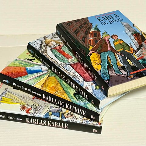 Bogsæt med flere bind i Karla-serien af Rene Toft Simonsen. Sættet omfatter blandt andet titlerne "Karlas kabale" og "Karla og Katrine". Bøgerne er indbundet og illustreret, og følger pigen Karla i hendes hverdag, familie- og venskabsrelationer. Egnet som højtlæsning eller selvlæsning for børn i skolealderen, afhængigt af læseniveau.