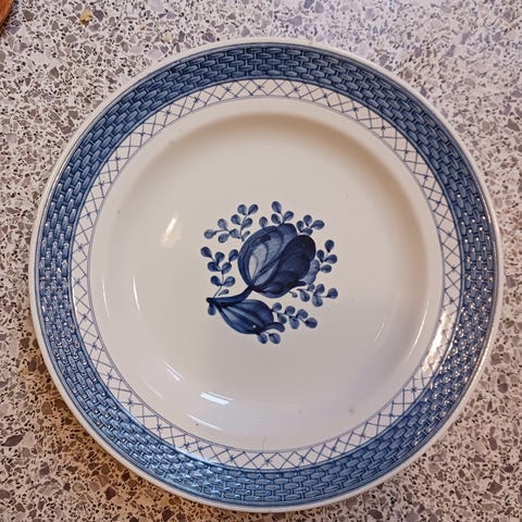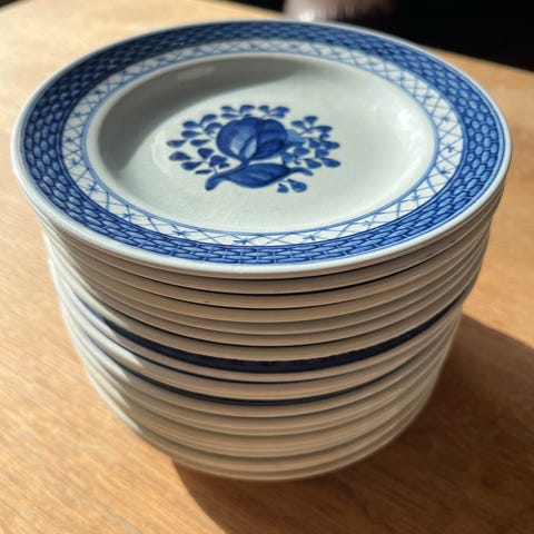 Royal Copenhagen frokost tallerkener i fajance med blå-hvidt dekormotiv. Tallerkenerne har forskellige landskabsmotiver i midten og en blå mønstret kant.