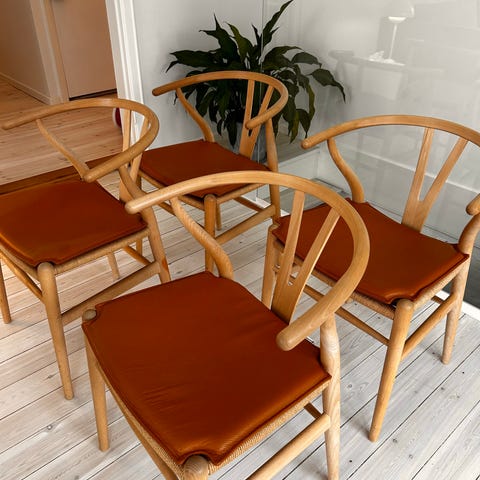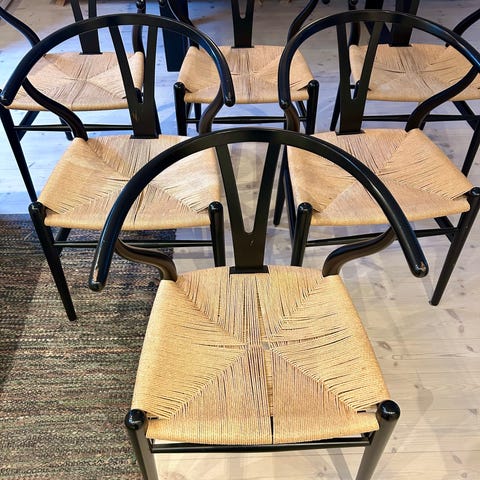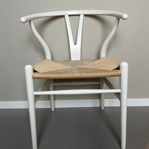 Carl Hansen stol designet af Hans J. Wegner. Klassisk træstol med buet ryglæn og armlæn. Sædet er udført i flettet naturmateriale med karakteristisk mønster. Egnet som spisebordsstol eller enkeltstående stol i stue eller køkken. Neutral, lys træfarve og naturfarvet flet, der passer ind i mange indretningsstile.