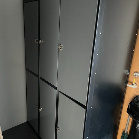 Metalskab garderobeskab med 2 rum i grå farve. Skabet har to separate aflåselige rum med smalle låger. Indvendigt er der bøjlestang og kroge til ophæng af tøj eller udstyr. Egnet til brug i fx bryggers, værksted, omklædningsrum eller garage til opbevaring af tøj, sko og andre genstande.