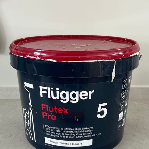 Nærmest ny spand Flügger flutex pro 3 liter i glans 5, råhvid standard farve. Ikke tonet.