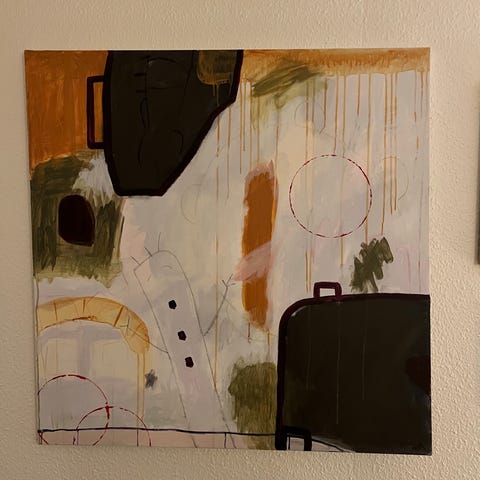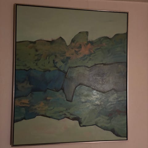 Abstrakt maleri på lærred med farverne blå, grøn, gul, orange og sort-hvid stribet mønster.