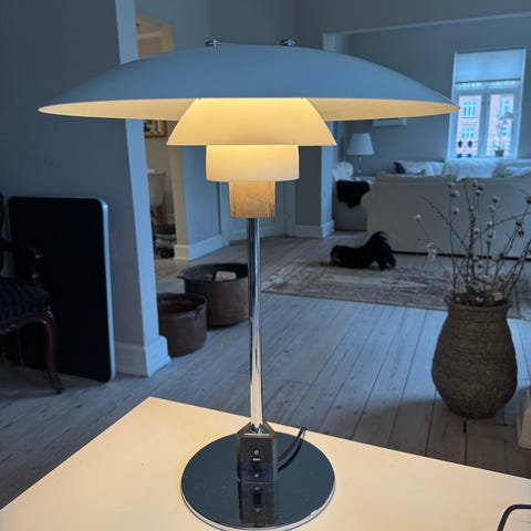 Louis Poulsen PH bordlampe designet af Poul Henningsen. Højde 44 cm, største skærm Ø 28 cm. Lampen har klassisk flerskærmsdesign med hvide glasskærme, der giver et blændfrit og jævnt lys. Fod og stander i krom. Lampen har ledning med afbryder. Velegnet som belysning på skrivebord, skænk eller sengebord. Kan leveres ifølge aftale.